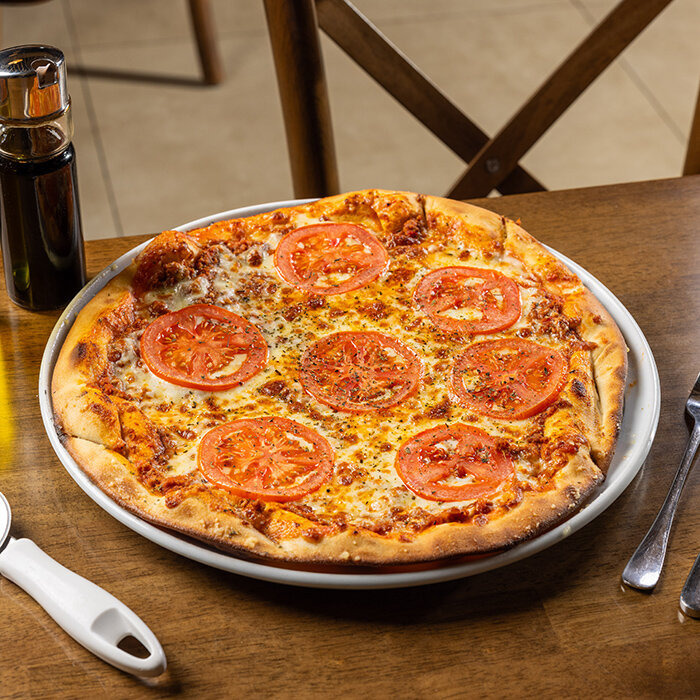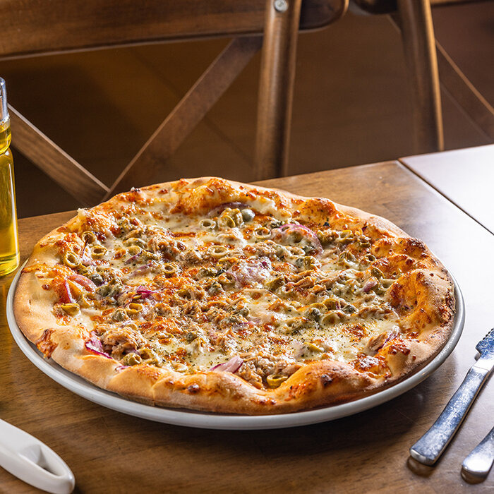 paradajková salsa, mozzarella syr, tuniak, cibuľa, olivy, capari 1, 4, 7, 12