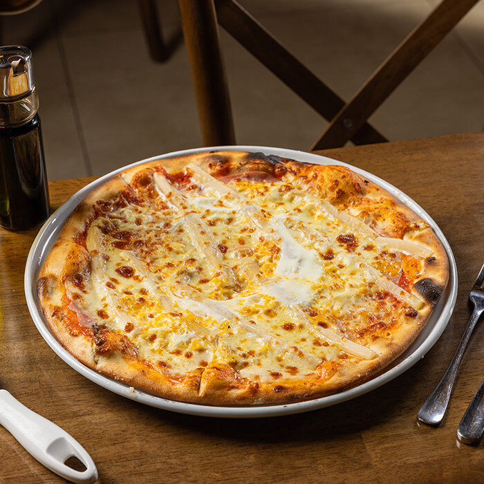 paradajková salsa, mozzarella syr, šunka, špargľa, vajíčko, cesnak 1, 3, 7, 12
