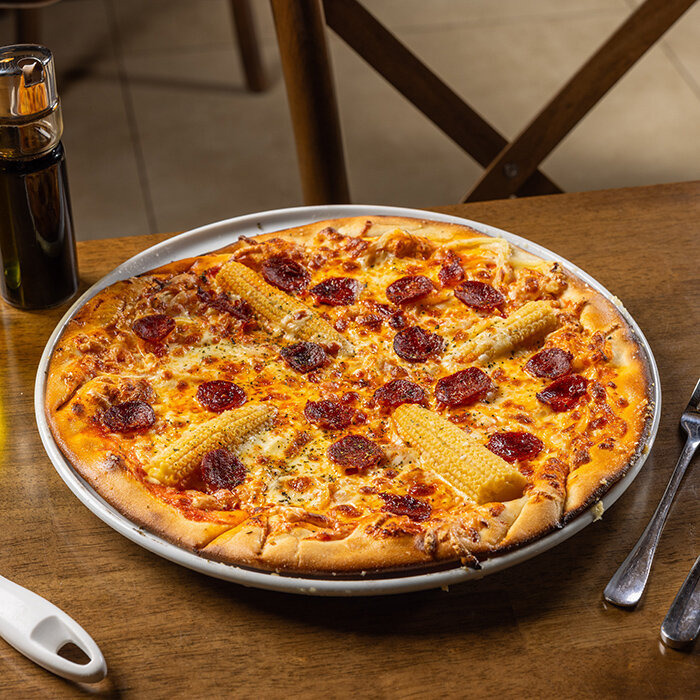 paradajková salsa, mozzarella syr, slanina, šunka, kukurica, šampiňóny 1,7,12