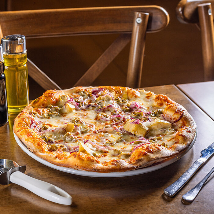 paradajková salsa, mozzarella syr, šunka, artičoky, olivy, cibuľa 1, 7, 12