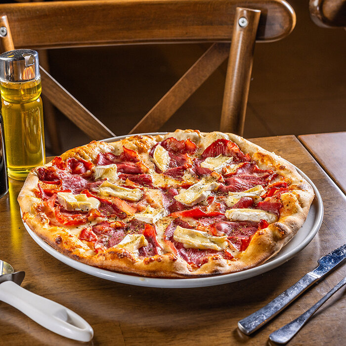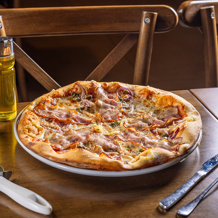 paradajková salsa, slanina, niva, mozzarella syr, baranie rohy, cibuľa 1, 7, 12