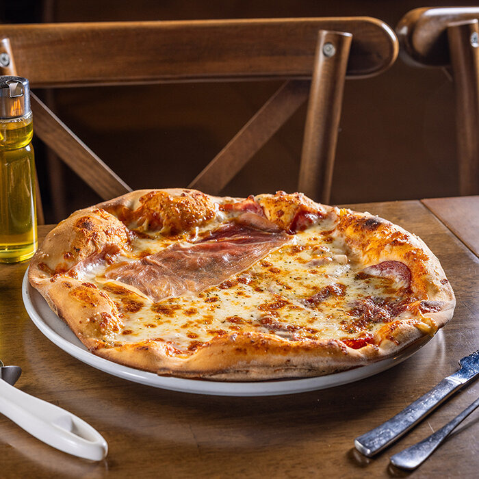 paradajková salsa, mozzarella syr, šunka, saláma, slanina, prosciutto crudo 1, 7, 12