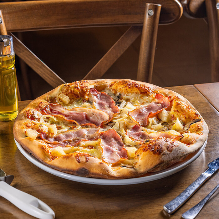 paradajková salsa, mozzarella syr, slanina, cibuľa, chilli papričky 1, 7, 12