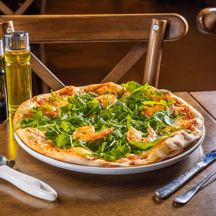 paradajková salsa, mozzarella syr, rukola, krevety 1, 2, 7, 12