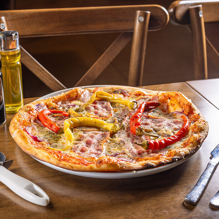 paradajková salsa, mozzarella syr, slanina, paprika, cibuľa, capari 1, 7, 12