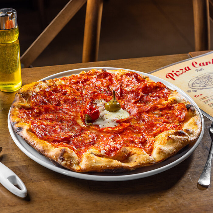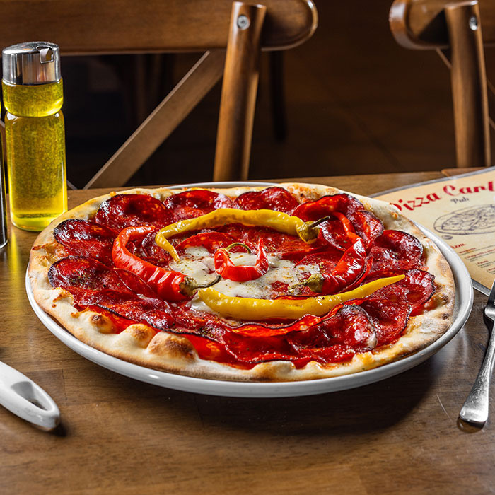 paradajková salsa, mozzarella syr, jemne pikantná pravá talianska saláma, feferónka 1, 7, 12