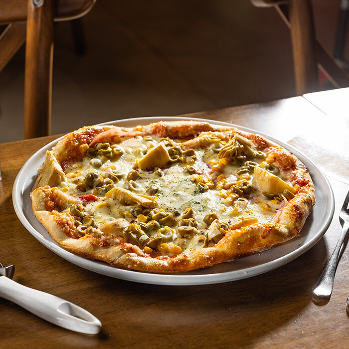 paradajková salsa, mozzarella syr, šunka, mäkký syr, artičoky, olivy, kukurica 1, 7, 12