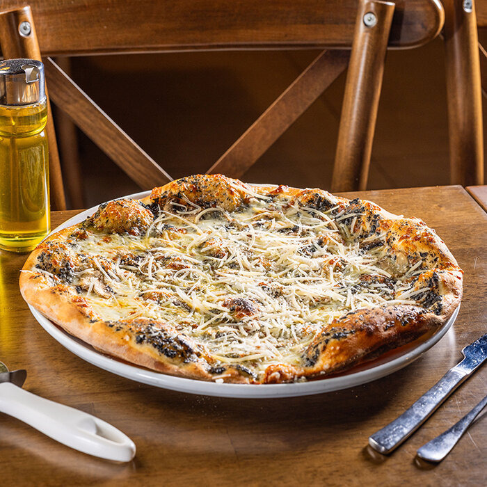 hľuzovková salsa, mozzarella, šampiňóny, parmezán, hľuzovkový olej 1,7,12