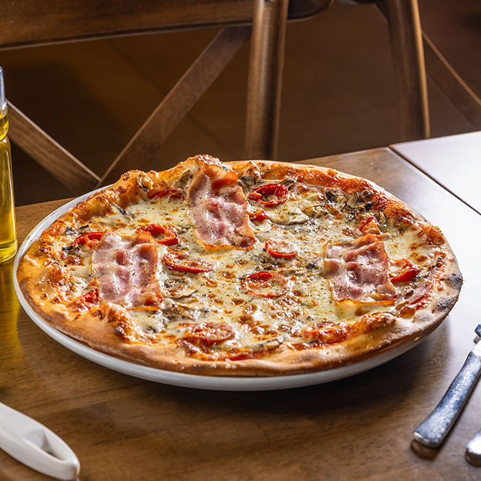 paradajková salsa, mozzarella syr, šunka, slanina, šampiňóny, feferóny 1,7,12
