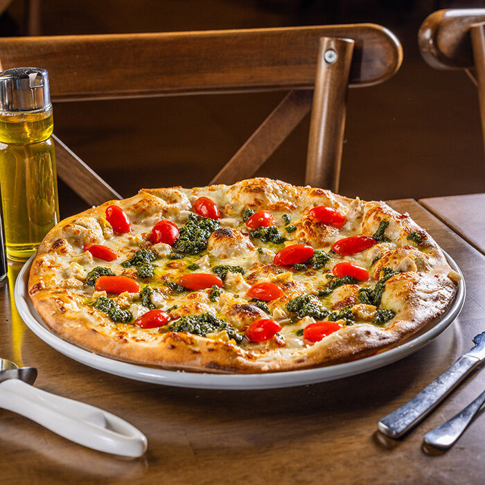 smotanový základ, kuracie mäso, cherry paradajky, pesto omáčka, mozzarella syr 1, 7, 8, 12