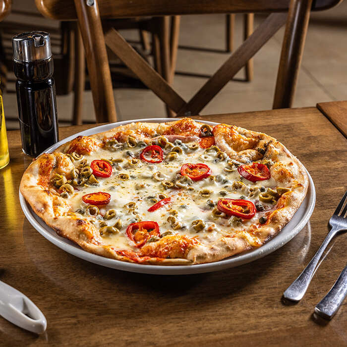 paradajková salsa, mozzarella syr, šunka, olivy, capari, feferóny 1, 7, 12