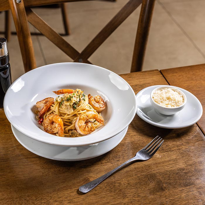 Na jemné plátky nasekaný cesnak, chilli papričky, kučeravá petržlenová vňať, olivový olej, krevety, parmezán, 350g 1,2,7,12