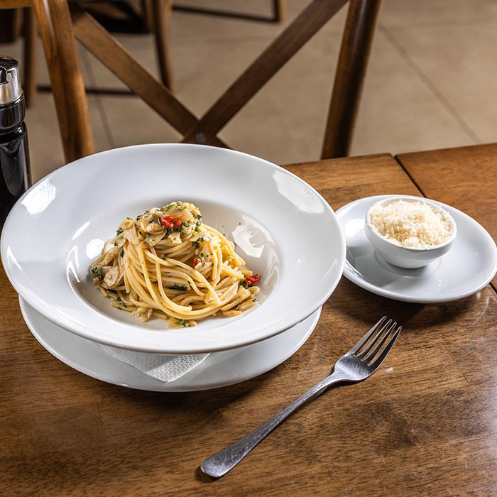 Na jemné plátky nasekaný cesnak, chilli papričky, kučeravá petržlenová vňať, olivový olej, parmezán, 300g 1,3,7,12